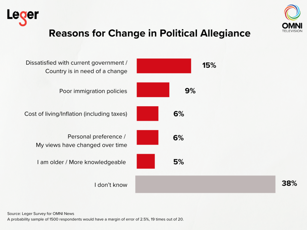 The OMNI-Leger poll found dissatisfaction with the current government tops the list of reasons provided by newcomers who said their political allegiance has changed, followed by poor immigration policies.