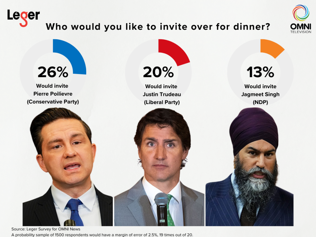 The OMNI-Leger poll found that while 28 per cent of those surveyed do not know which federal leader they would invite to dinner, 26 per cent would like to break bread with Poilievre, compared to just two in 10 that would choose the current Prime Minister.