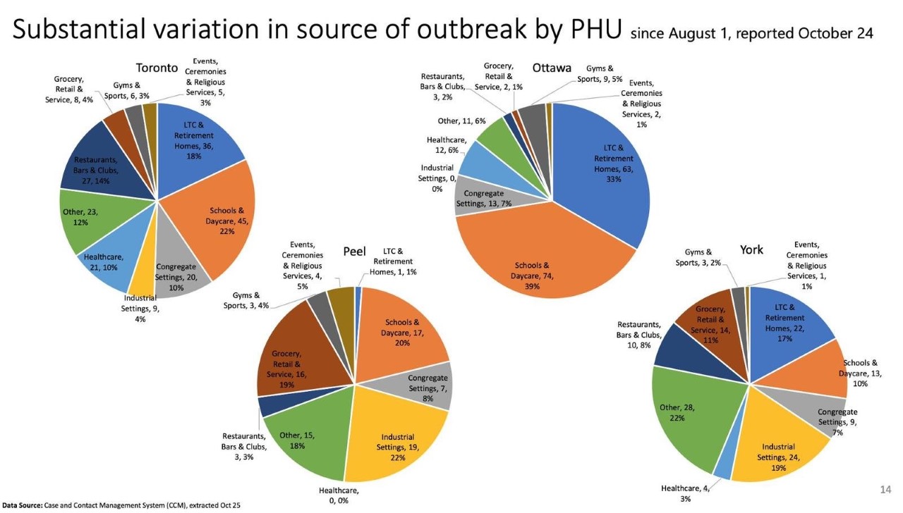 Data from Peel Public Health shows the majority of COVID-19 outbreaks in the region come from industrial settings, grocery stores and other retailers, with only a small percentage originating from religious services and congregated settings.