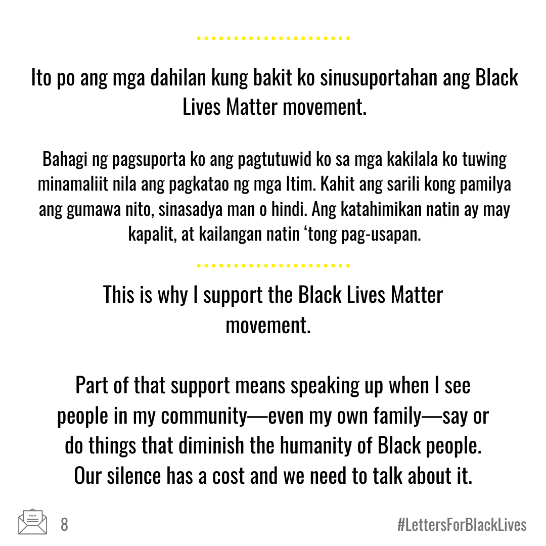 Talking to your parents about anti-Black racism can be difficult, especially for children of immigrants. After the murder of Philando Castile, a Black man killed by police during a routine traffic stop in St. Paul, Minnesota, a group of Asian-Americans worked together to write Letters for Black Lives: a crowdsourced project created to help young people start conversations around the prevalence of anti-Black racism within their own communities.
