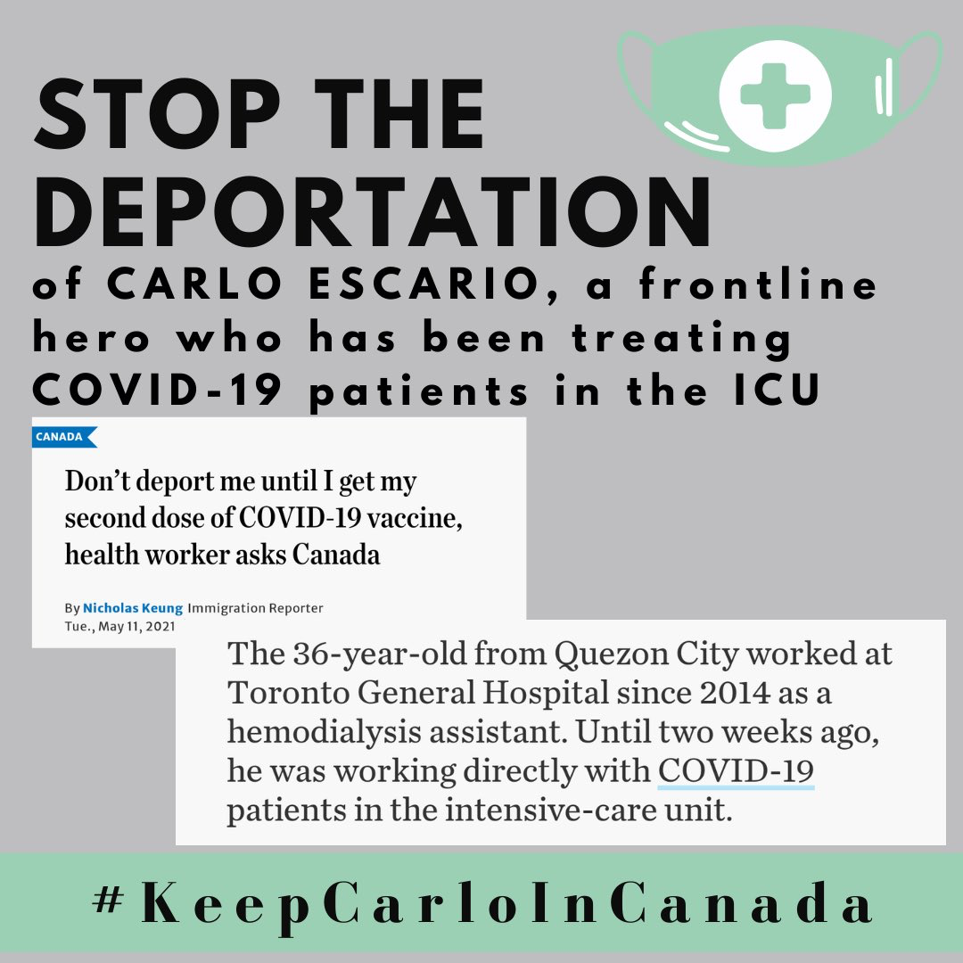 Escario, who has been working as a hemodialysis assistant for seven years at Toronto General Hospital, has been caring for COVID-19 patients since the pandemic began. He received one dose of the COVID vaccine but requested his deportation be delayed to give him an opportunity to receive his second shot.