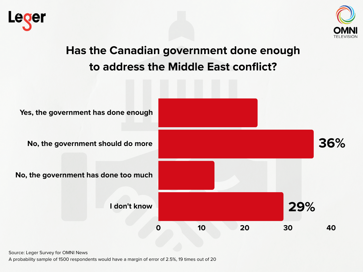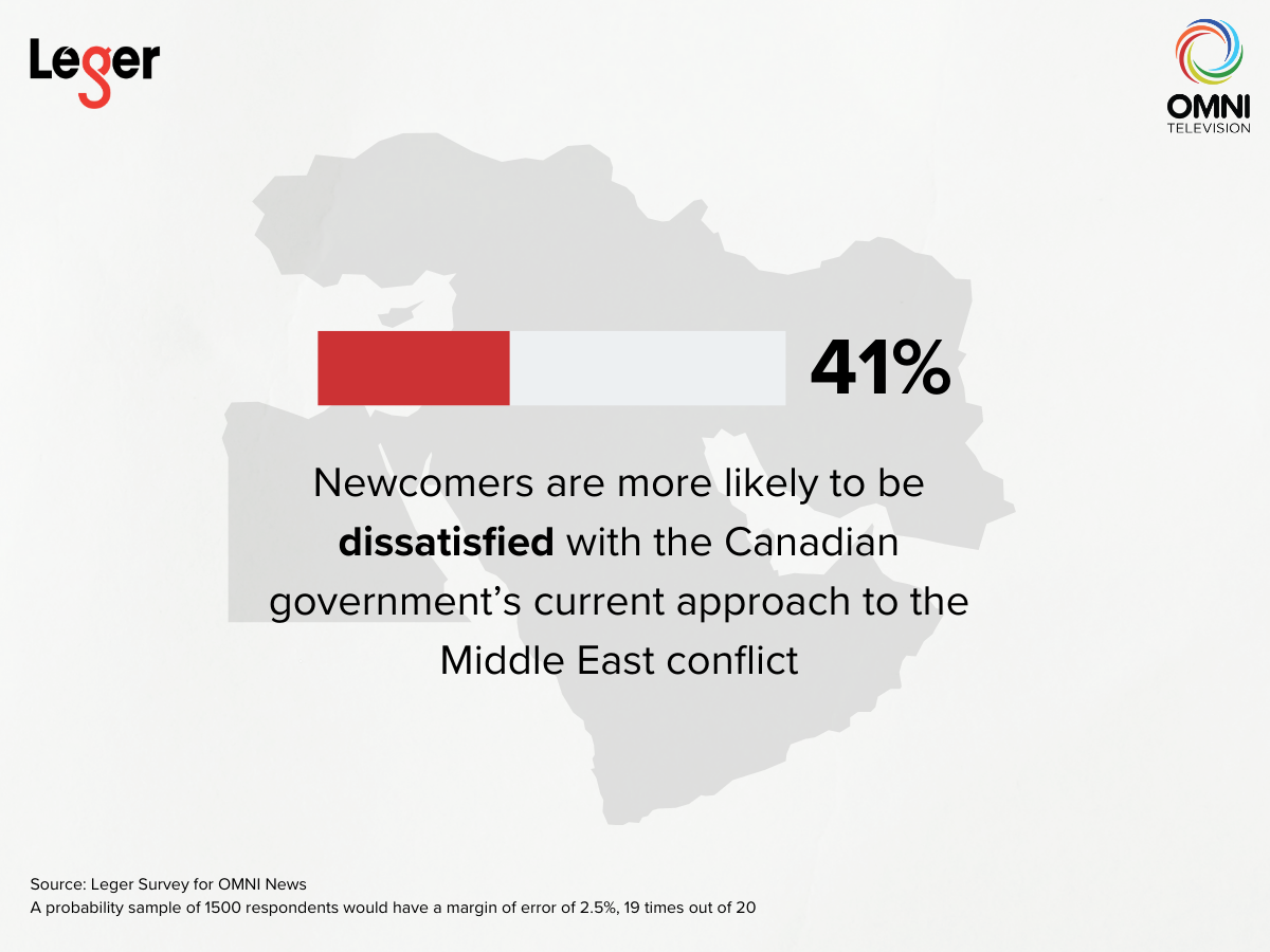 A new poll commissioned by Leger exclusively for OMNI News found that 71 per cent of the immigrants surveyed want Israel and Hamas to lay down their arms. More immigrants are dissatisfied with Ottawa’s approach to the conflict at 41%, while 29% expressed satisfaction. The remaining 30% said they do not know.