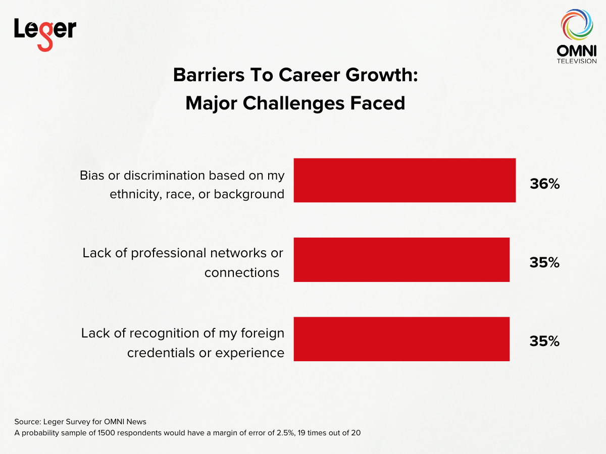 The OMNI-Leger poll also highlights that over a third of immigrants have faced discrimination at work – with majority citing ethnic, racial or cultural biases as a top reason for difficulty advancing their careers. These barriers are more salient amongst younger immigrants and those who identify as BIPOC.