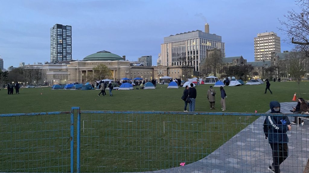 Pro-Palestinian demonstrators have set up an encampment at King’s College Circle at the University of Toronto, calling on the university to sever financial ties with the Israeli government and for a ceasefire in the ongoing war in Gaza.