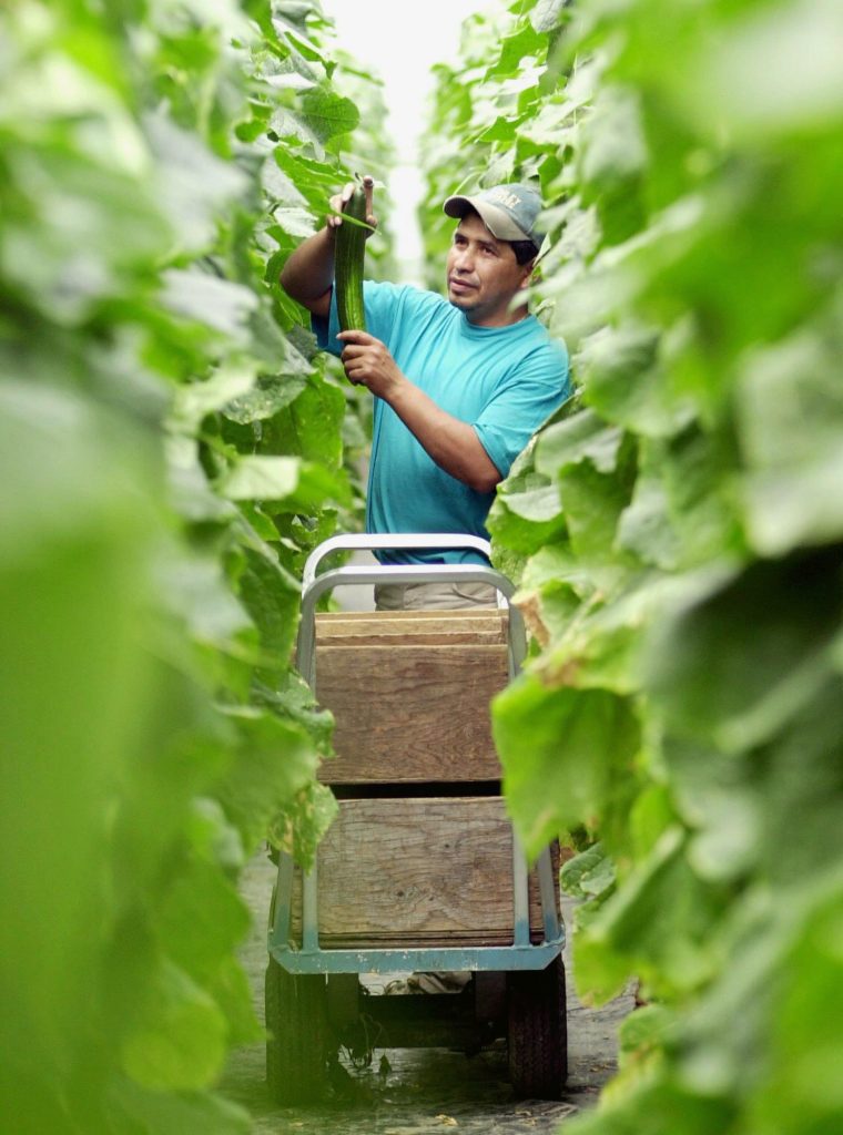 Ignancio Vazquez, a migrant worker from Cuijing, Mexico, harvests cucumbers in Leamington, Ont. on May 30, 2002. Researchers have found that many workers from Mexico, Jamaica, the Philippines and other countries develop ailments linked to the gruelling work they do on Canadian farms, largely in British Columbia and Ontario. THE CANADIAN PRESS/ Jason Kryk