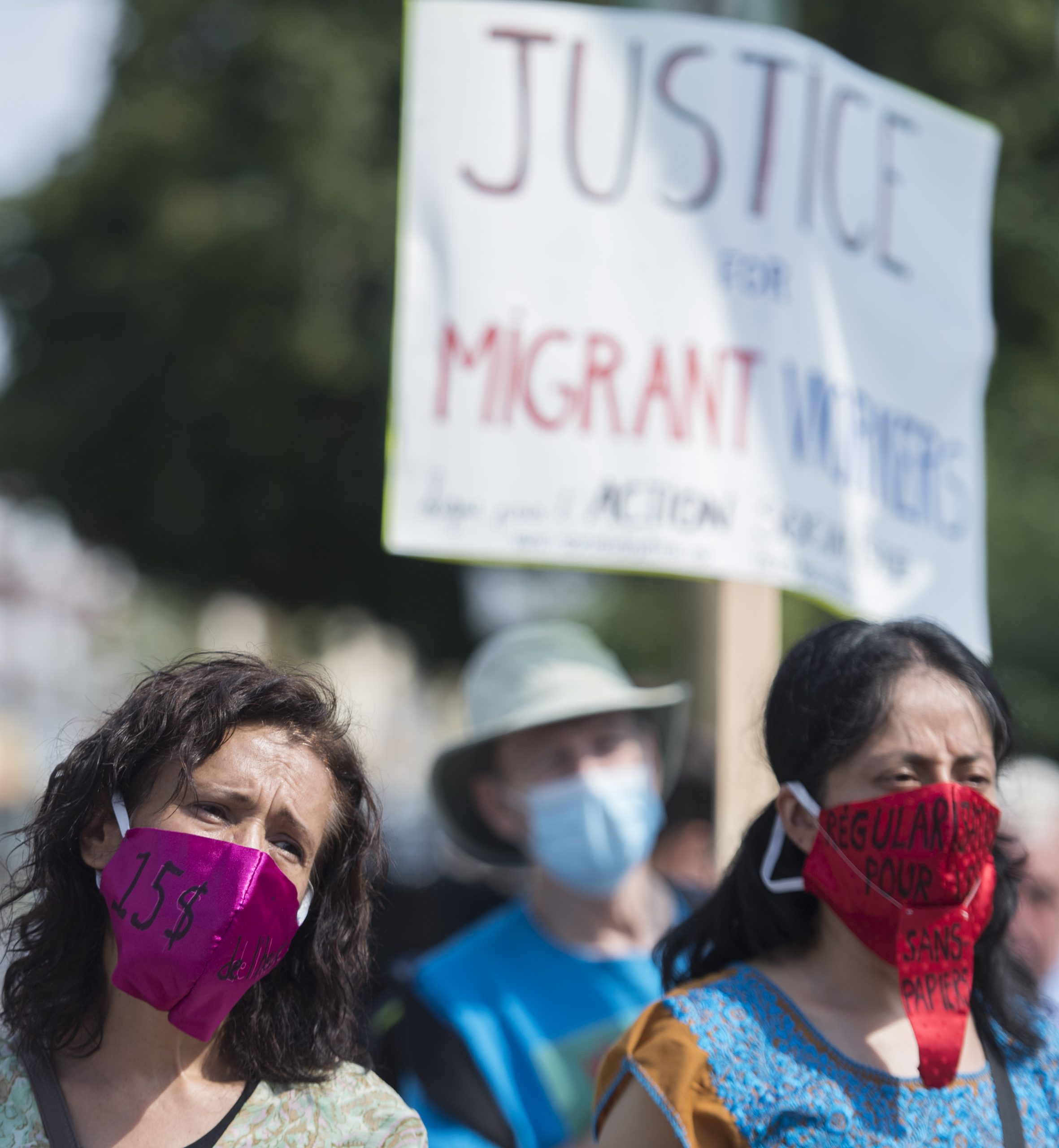 People attend a protest in Montreal, Sunday, August 23, 2020, where they called on the government to grant permanent residency status to all migrant workers and asylum seekers. The COVID-19 pandemic continues in Canada and around the world. THE CANADIAN PRESS IMAGES/Graham Hughes